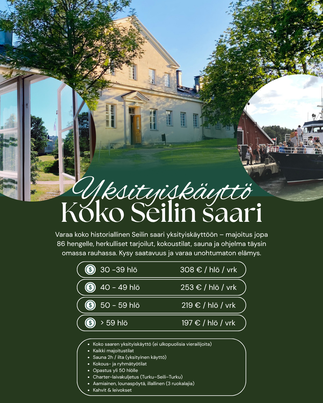 Tervetuloa Seiliin – paikkaan, jossa yrityksesi voi kokea jotain ainutlaatuista ja inspiroivaa. Seilin saari Saaristomerellä yhdistää luonnon rauhan, rikkaan historian ja modernit tilat, tarjoten täydellisen ympäristön yritystapahtumille, kokouksille, koulutuksille ja virkistyspäiville.